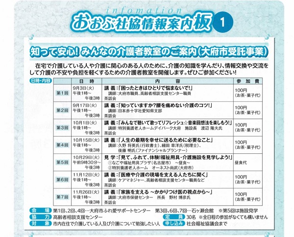 大府市社会福祉協議会の介護者教室は、在宅で介護している家族等を対象に、介護の基本的な知識や技術を習得し、また、日ごろの介護の悩みや体験などの情報交換や茶話会を通して不安や負担を軽減することを目的としています。