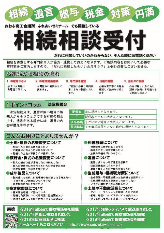 すでに発生した相続、将来起こりうる相続について、不安やお悩みを抱えている方は大勢いらっしゃいます。そして相続に関する問題点は複雑で多岐にわたります。相続税・不動産・登記・遺言・保険・遺産分割等についての問題点、状況、背景を総合的に判断し、様々な角度から解決に向けての提案をさせていただきます。