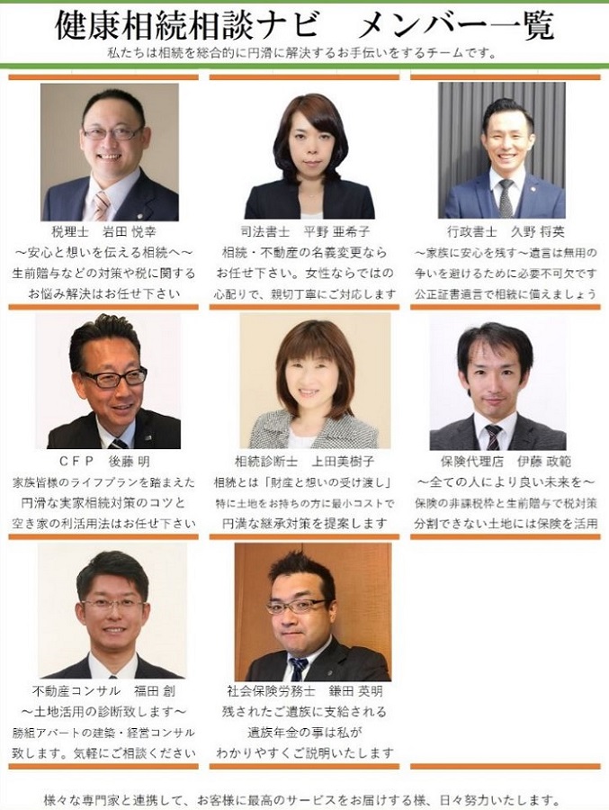 税理士、司法書士、行政書士、ファイナンシャルプランナー、相続診断士、保険代理店、不動産コンサルティング会社、社会保険労務士が在籍し、全員が相続問題解決のノウハウと実績を持ち合わせた専門家です。